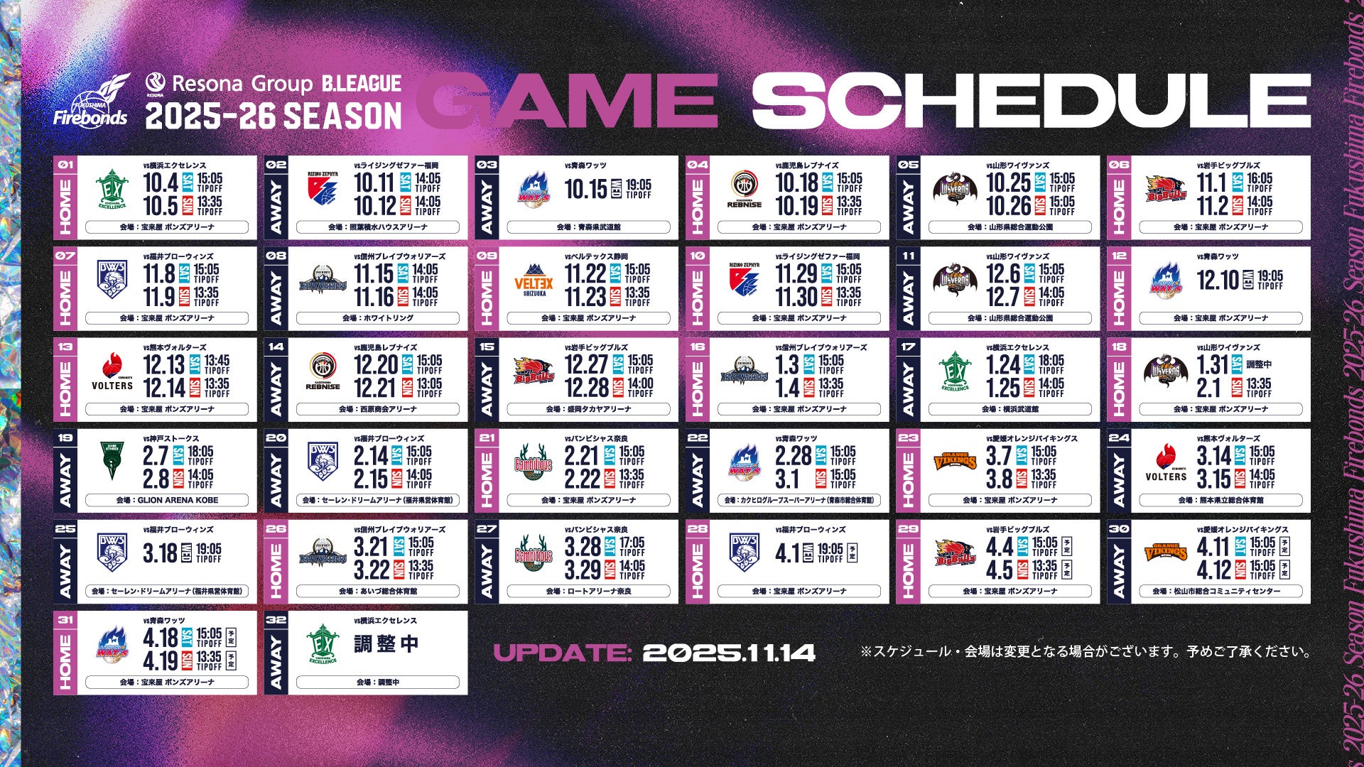 [2025.11.14] りそなグループ B.LEAGUE 2025-26シーズン 17節-27節 試合スケジュール決定のお知らせ