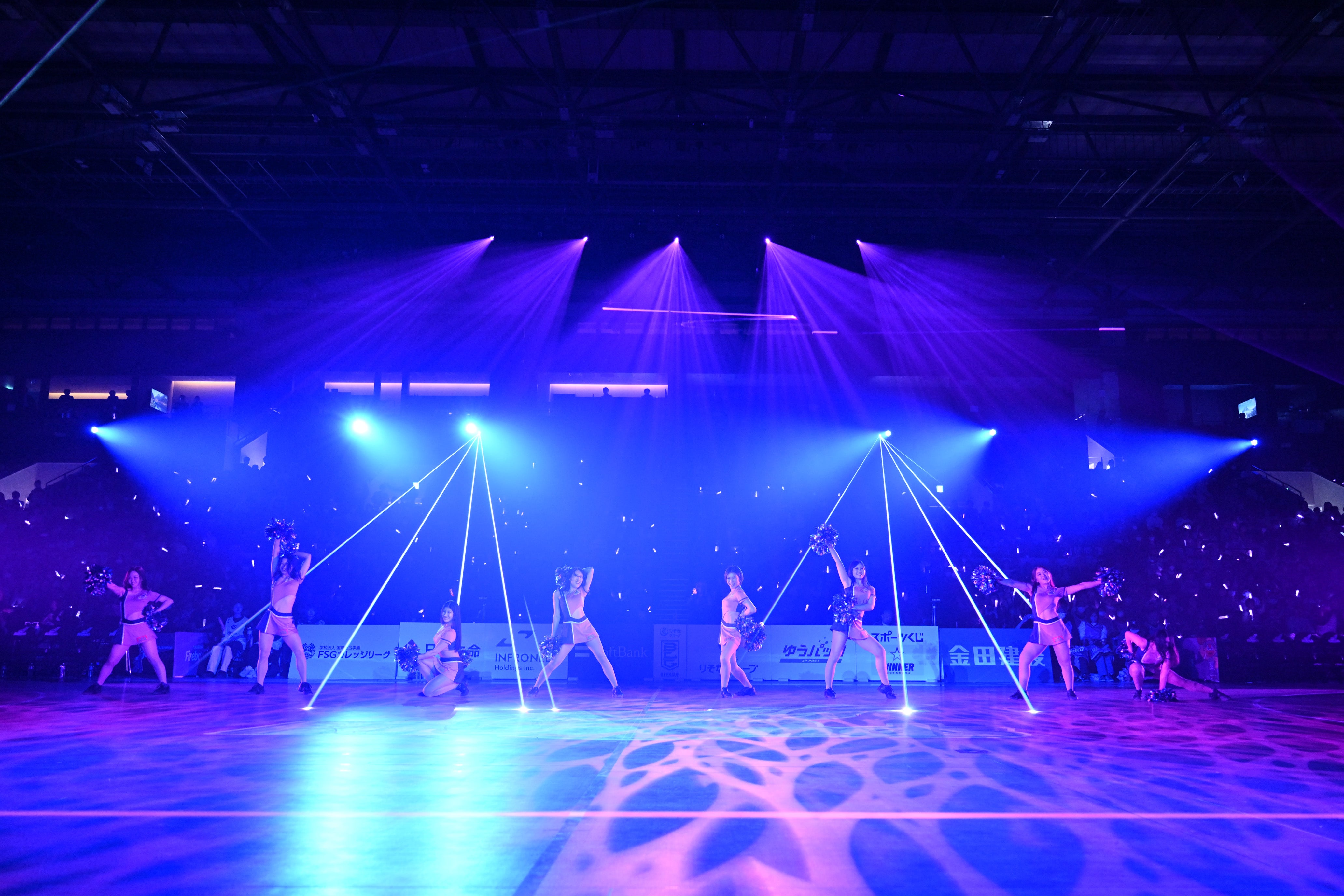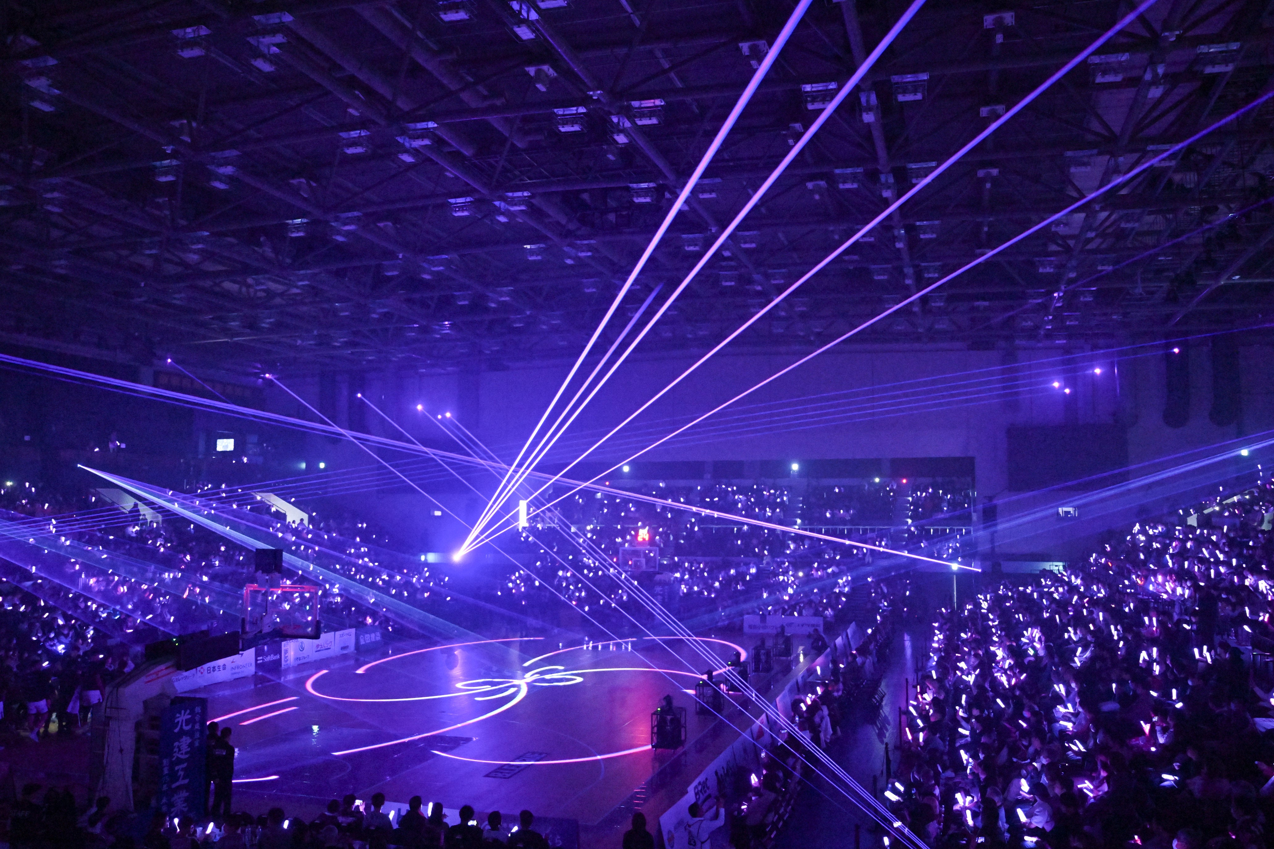 試合開始1時間前に始まるオープニングセレモニーでは、光と音の演出でアリーナならではの空間を作り出します!暗転時に使用するペンライトはグッズブースにて販売しておりますので、試合前から会場内の一体感を一緒に創り出しましょう!