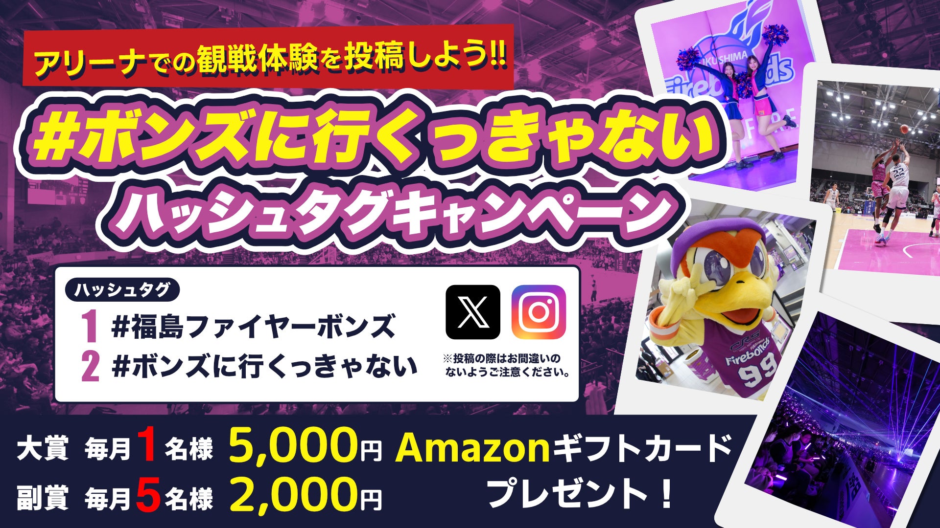アリーナでの観戦体験を写真又は動画で撮影して、指定のハッシュタグと共にXまたはInstagramへ投稿。投稿していただく写真は福島ファイヤーボンズのホームゲームでしか味わえない体験をご投稿ください!