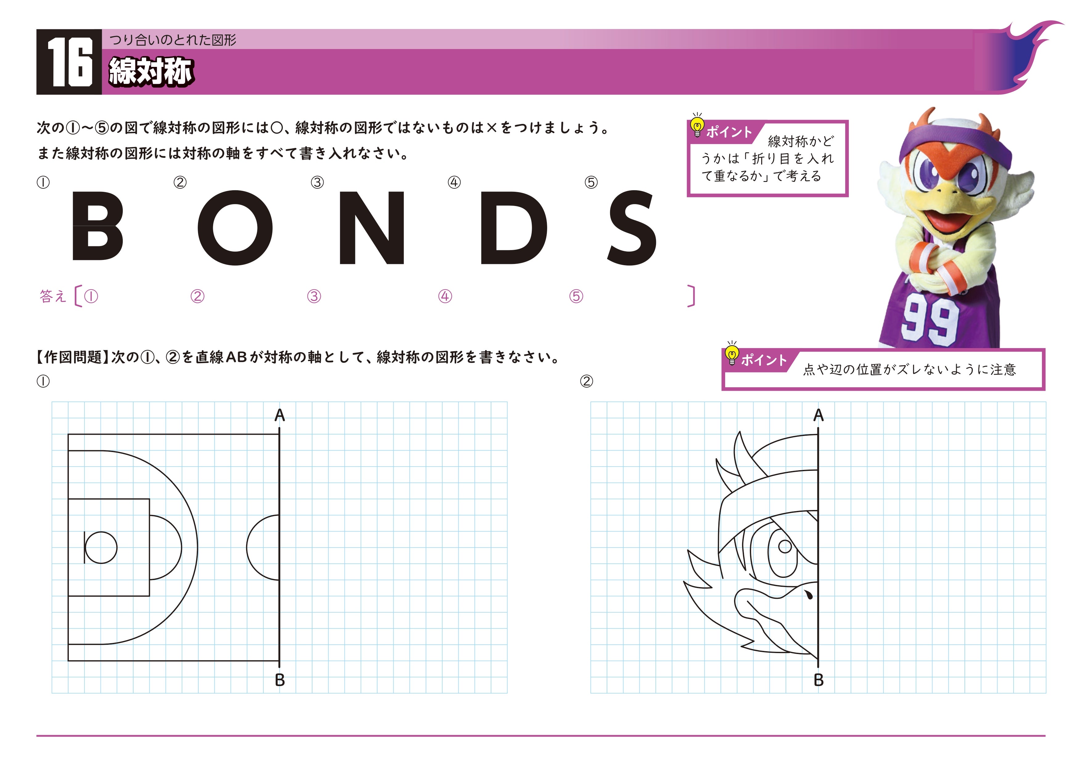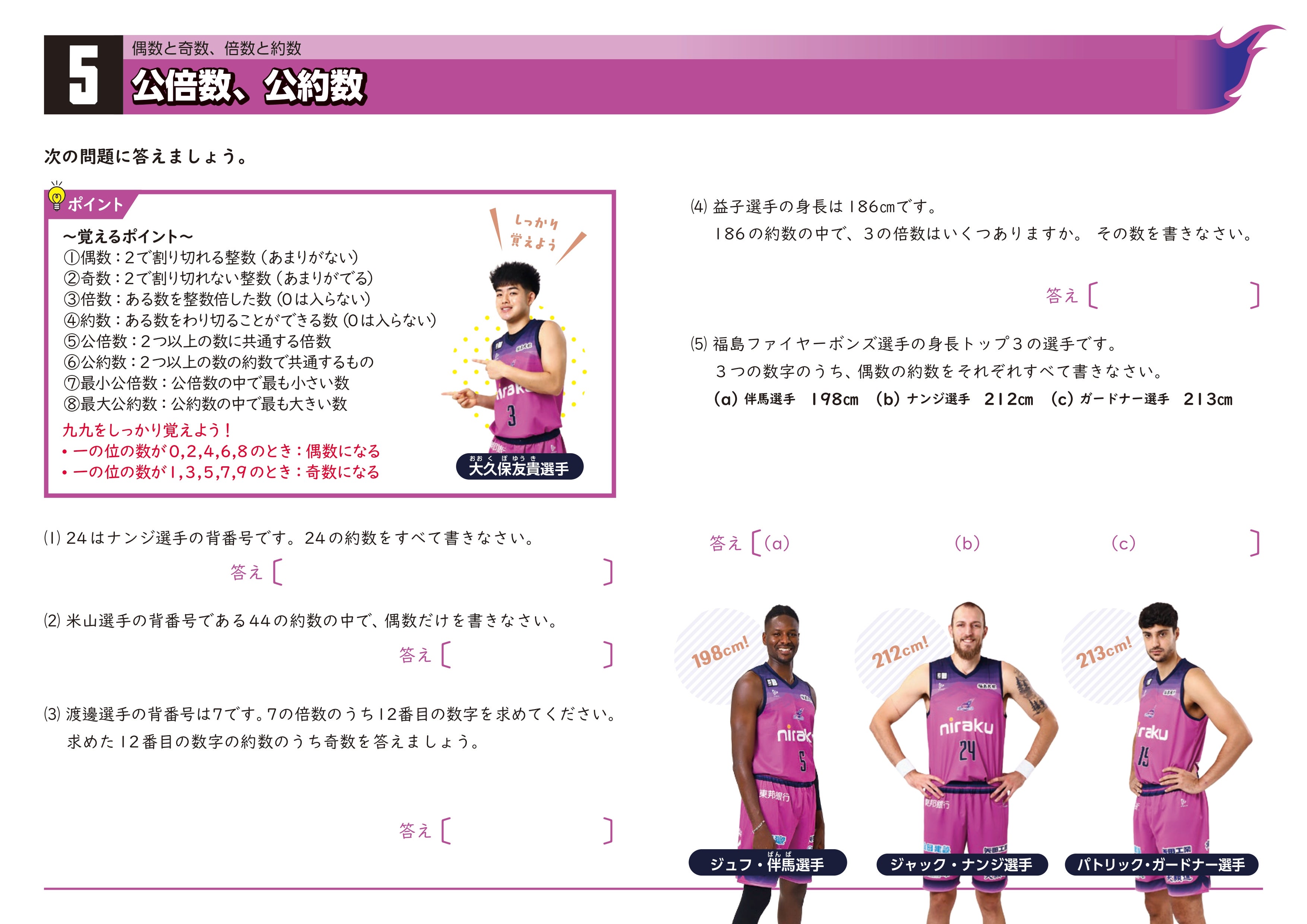 『福島ファイヤーボンズ算数ドリル』は、バスケットボールを題材にした算数問題や、チーム・選手に関する楽しいコラムなどを掲載。