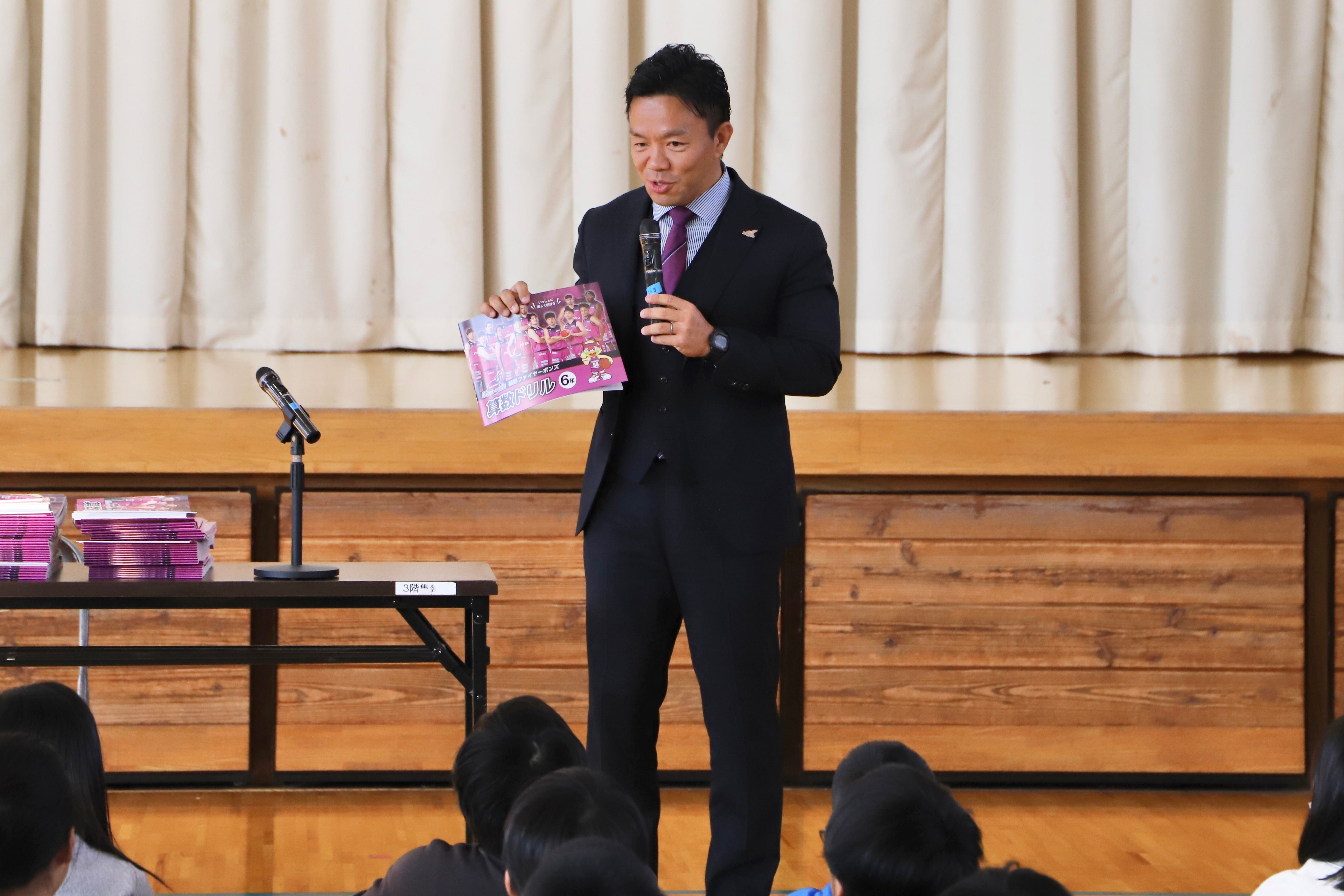 発刊にあたり郡山市立桜小学校にて、寄贈式を実施し、西田代表と中野司選手とボンズくんが参加しました。今後は、スポーツを通じた教育・地域活性化活動を継続を目的に、郡山市内の希望校に配布を予定しております。地域の企業・行政・教育機関と連携を密にしながら、次世代の育成と地域に根ざしたクラブ運営を推進していきます。
