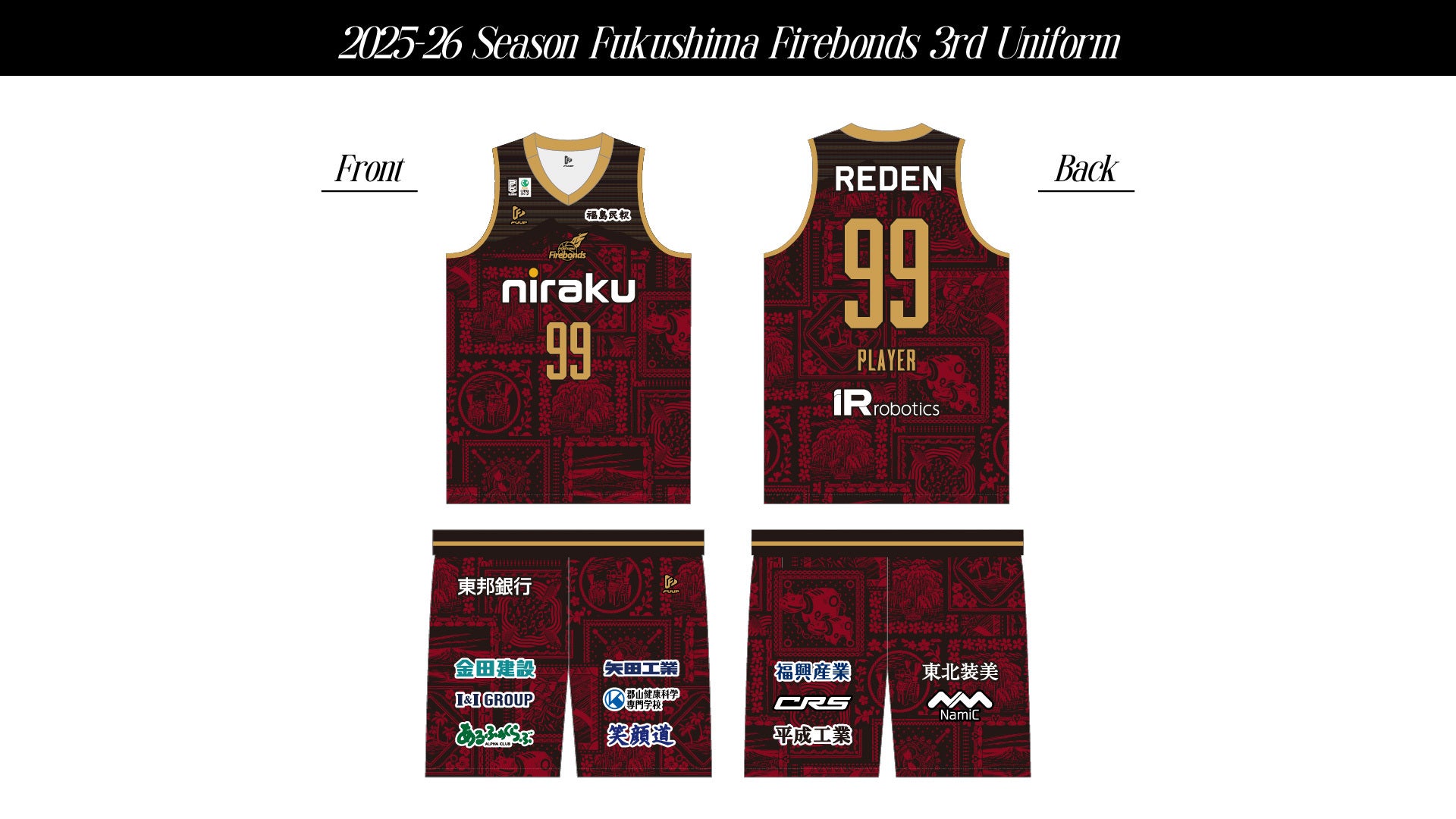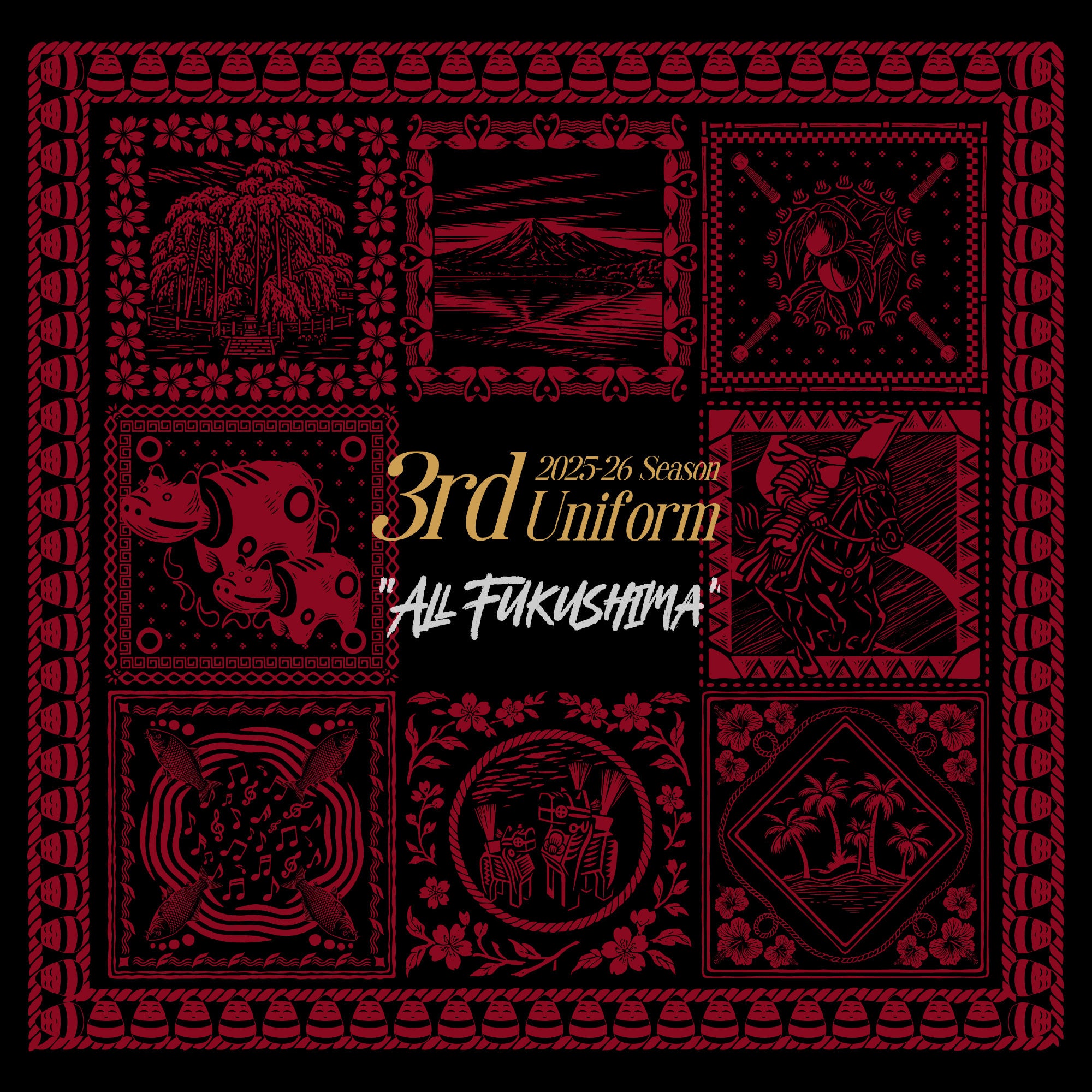 東日本大震災が発生した3月に開催するホームゲームで着用する3rdユニフォーム。福島県全体を纏い、県内すべての人々とともに力強く前に進んでいく想いを表現しています。