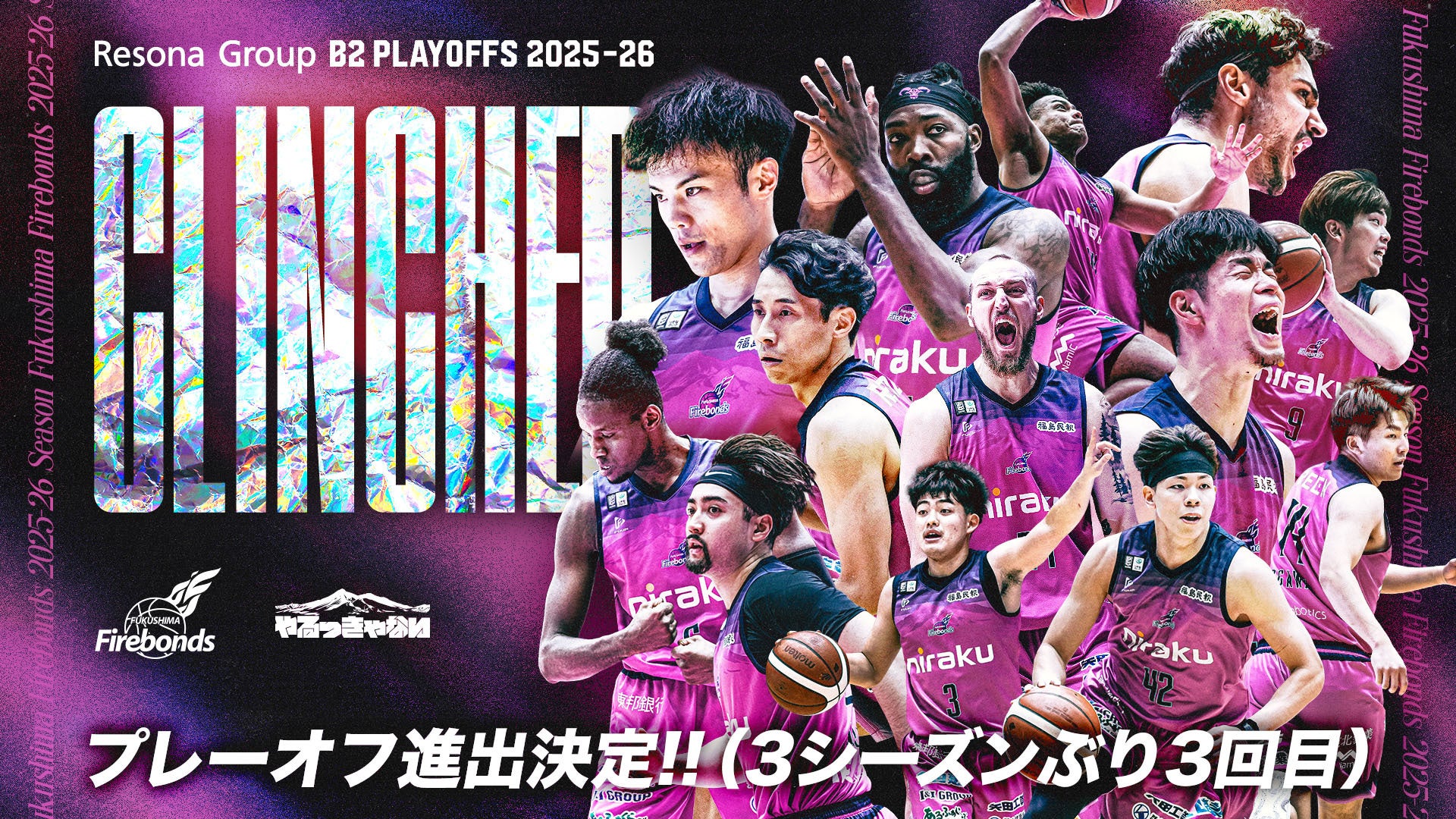 3/18(水)開催の第25節 GAME1 福井ブローウィンズ戦での勝利をもって、福島ファイヤーボンズの『りそなグループ B2 PLAYOFFS 2025-26』への進出が決定いたしましたのでお知らせいたします。