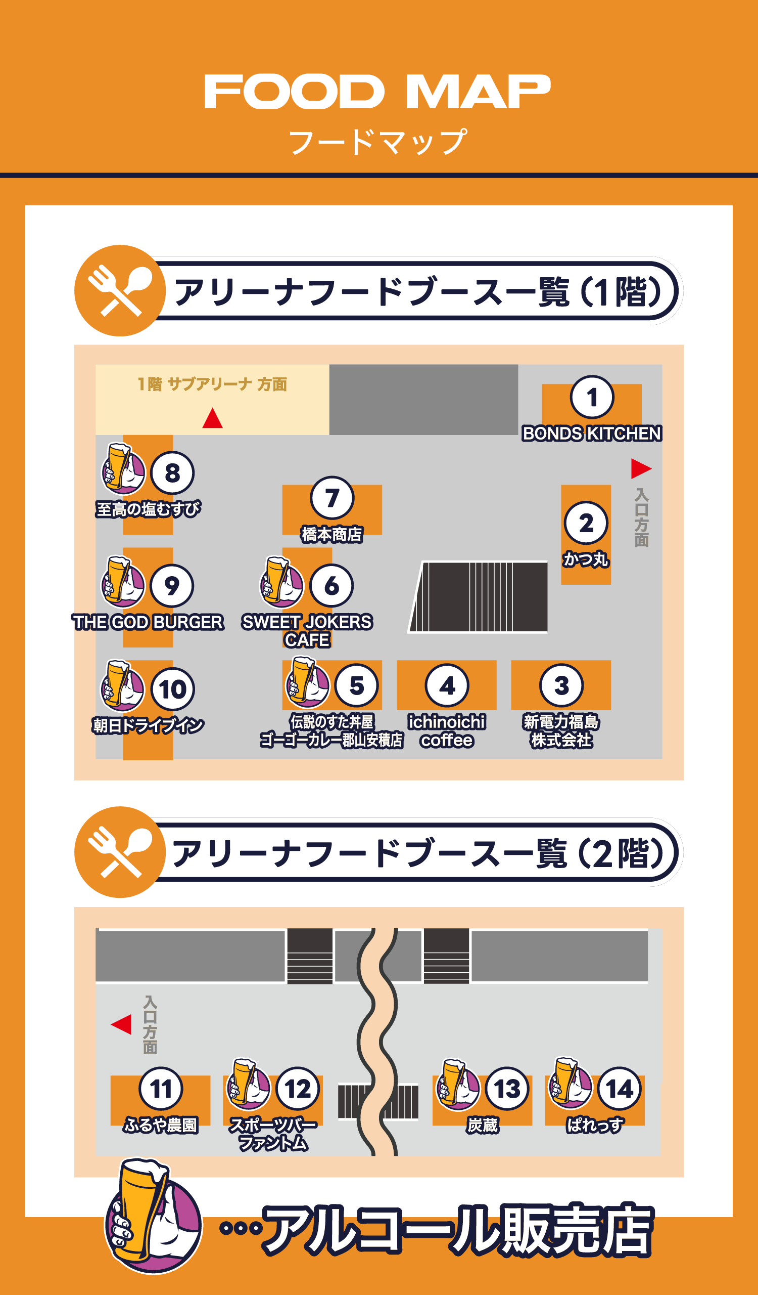 当日は、1階サブアリーナにビアガーデンが登場!さらに、アルコールを取り扱う店舗も多数出店し、観戦とあわせてグルメもお楽しみいただけます。