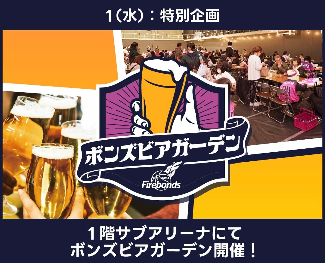 この度、4月1日(水)宝来屋ボンズアリーナにて開催される平日ナイトゲーム、福井ブローウィンズ戦では「ボンズビアガーデン」を実施いたします。
