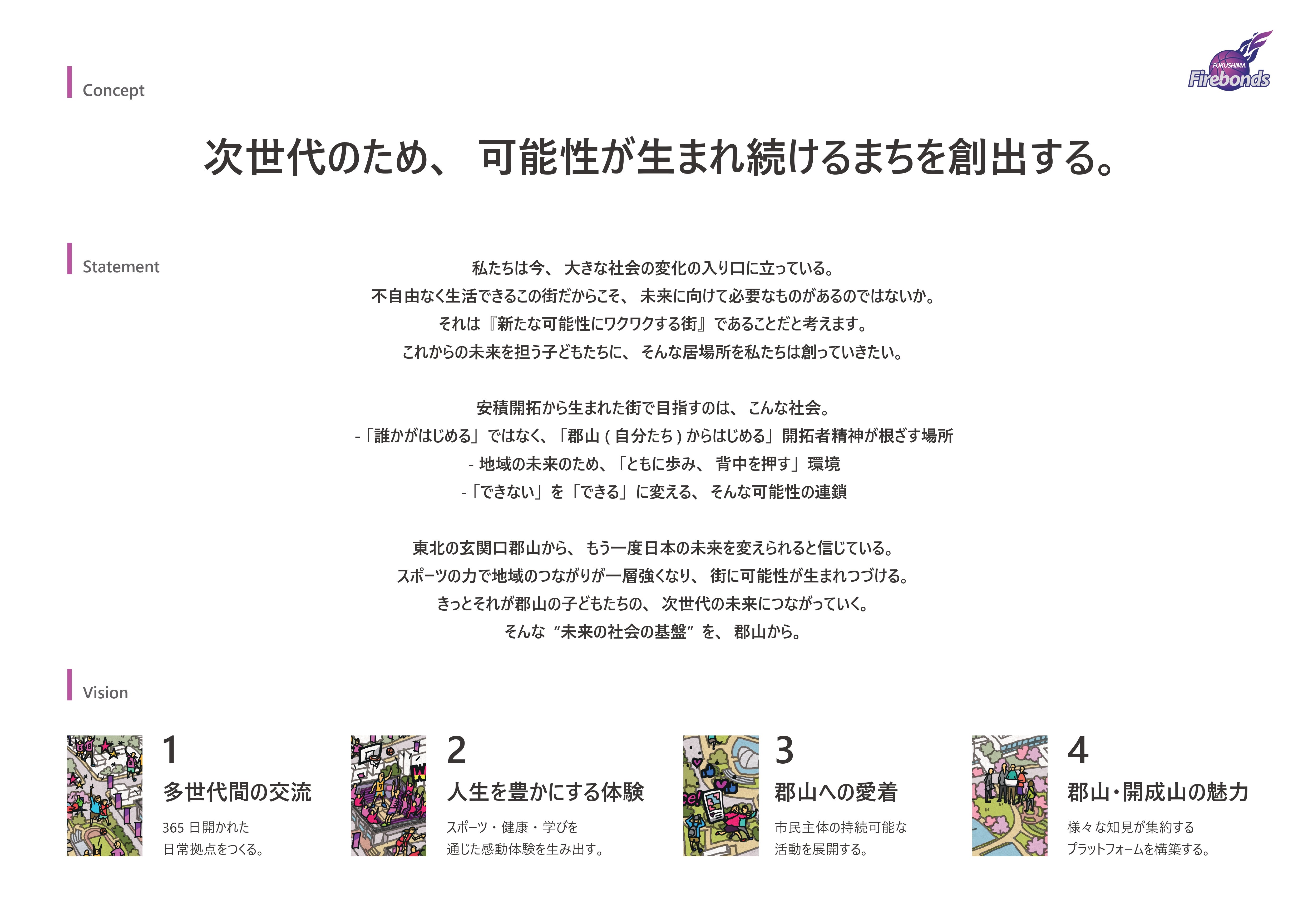 今回の未来ビジョン策定にあたり、ファイヤーボンズの自己満足で絵を描いただけでは文字通り絵に描いた餅で終わってしまうため、郡山市の文化スポーツ観光部、スポーツ振興課の皆様からもアイデアをいただき、経験豊富な専門家も交えて検討を進めてまいりました。ご協力いただいた方に心より感謝申し上げます。このビジョンは現時点で100点満点のものではありません。地域の皆様とともに歩みながら、ひとつひとつを実現させ、ボンズが「地域連携の核だね」と1人でも多くの方に言っていただけるよう、開成山から福島全体へ、そして全国へ。この挑戦を続けていきます。