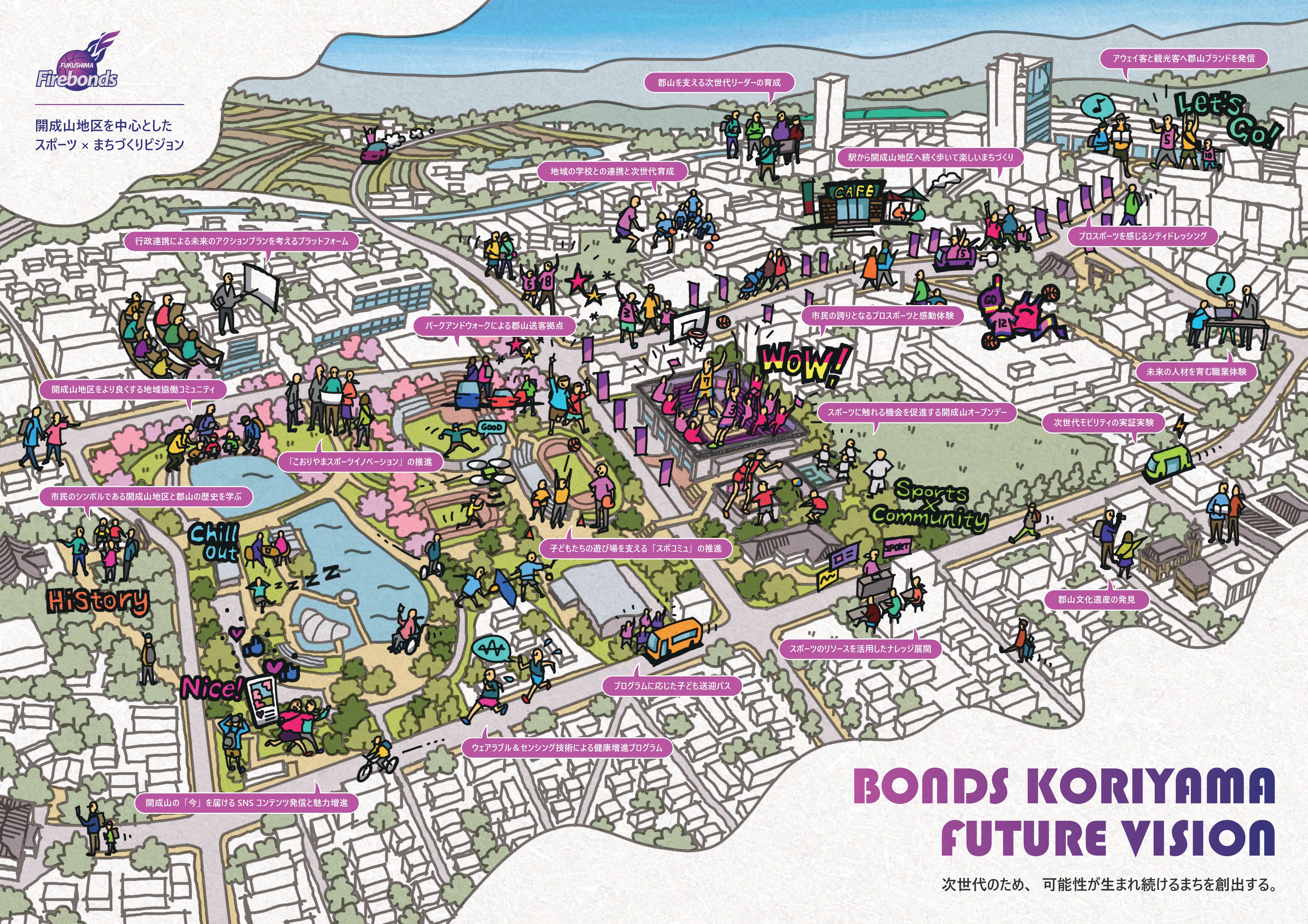 中心に置いたビジョンは、「次世代のため、可能性が生まれ続けるまちを創出する」。このスケッチは都市計画や施設整備の図面ではなく、ボンズが描く地域活動の将来像です。郡山市・開成山地区を舞台に、ここで実際に起こりうる「人の動き・出会い・挑戦」の場面を1枚の絵として描いたコミュニティモデルです。ボンズと地域の皆さまが一緒に描いた、未来への意志表明です。
