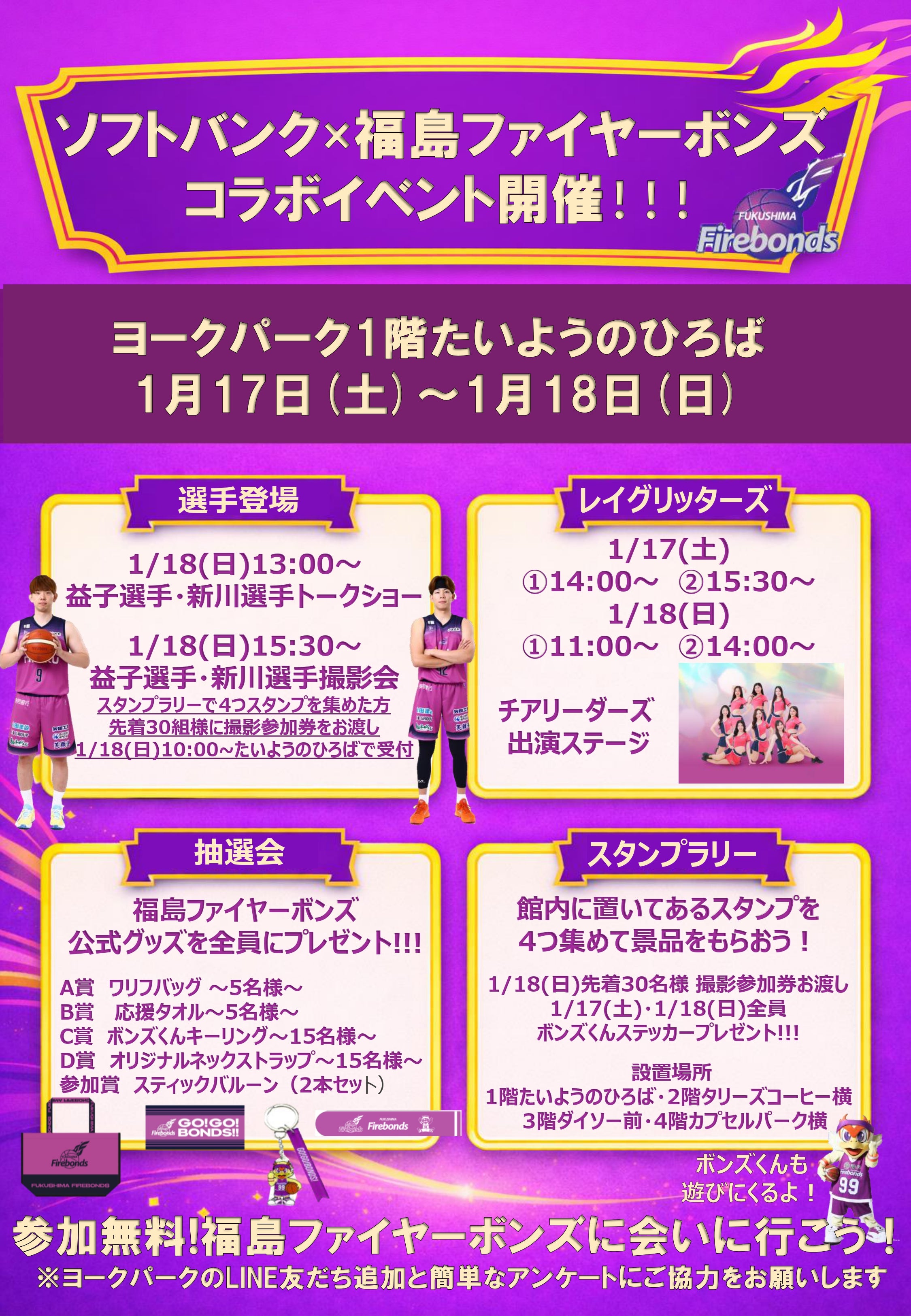 この度、1月17日(土)、18日(日)に、ヨークパーク 1F たいようの広場にて「ソフトバンク×福島ファイヤーボンズ コラボイベント」を実施いたします!